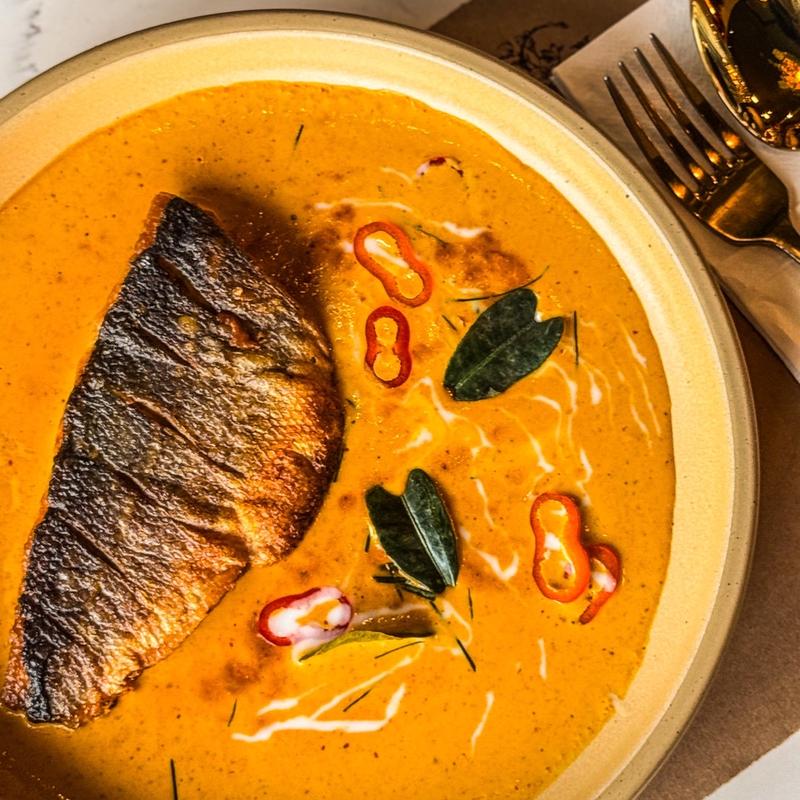 Grilled branzino with Chu Chee coconut red curry, kaffir lime leaves, long hot chili pepper.