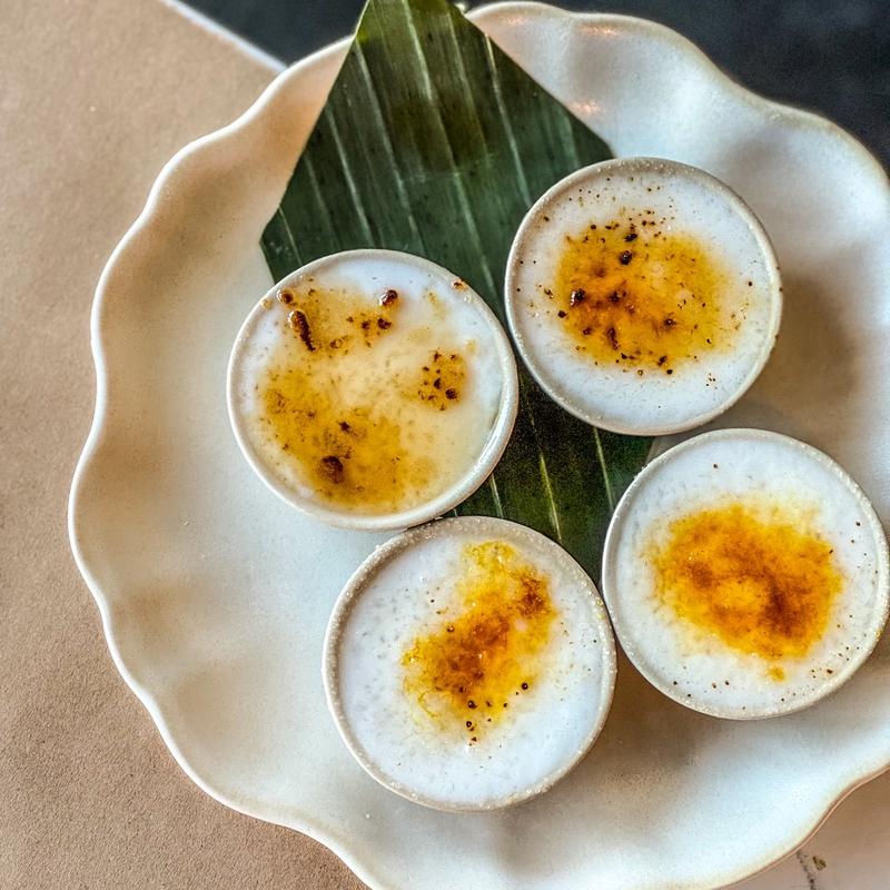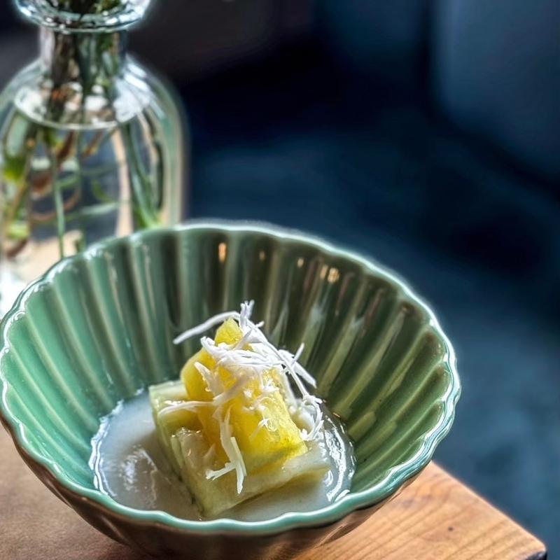 Sweet simmered cassava in syrup, topped with coconut milk and young coconut.