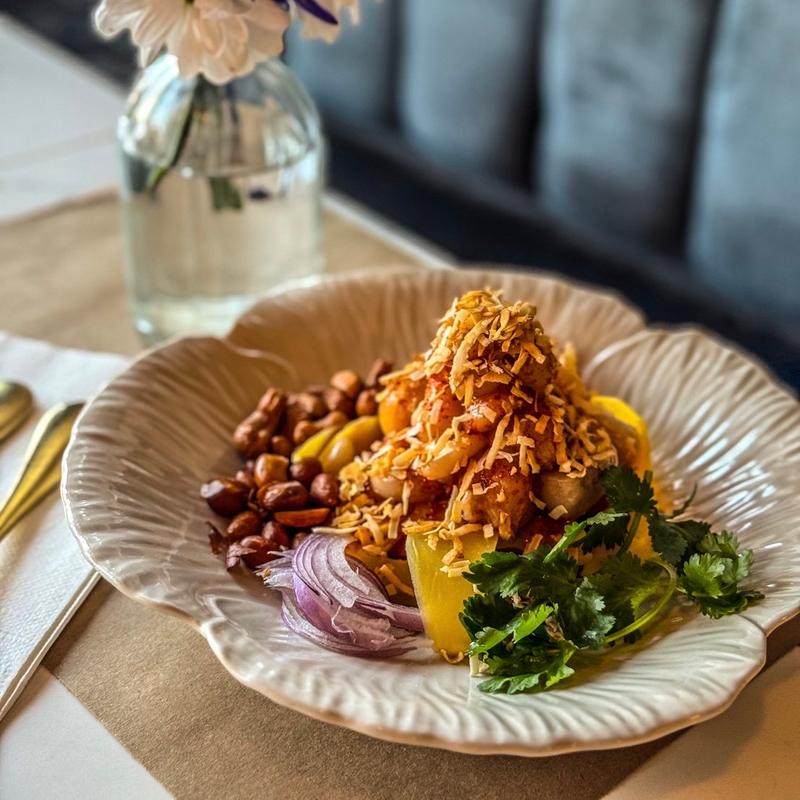 Fried whole de-boned branzino fish with mango, onion, scallion, cilantro, tomatoes, lemongrass, galangal, mint, dried chili, and cashew nut with chili lime dressing.