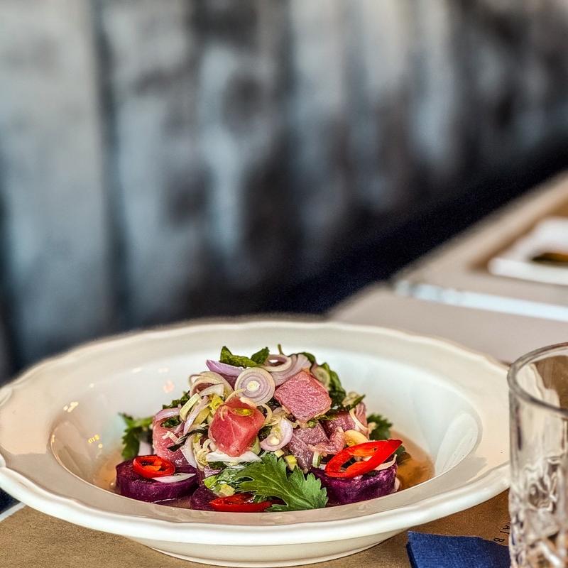 Fresh tuna salad with purple sweet potato, shallot, lemongrass, mint, and chili lime dressing