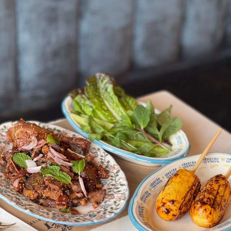 Grilled strip loin, toasted rice powder, and fried garlic served with sticky rice, and Thai spicy sauce.