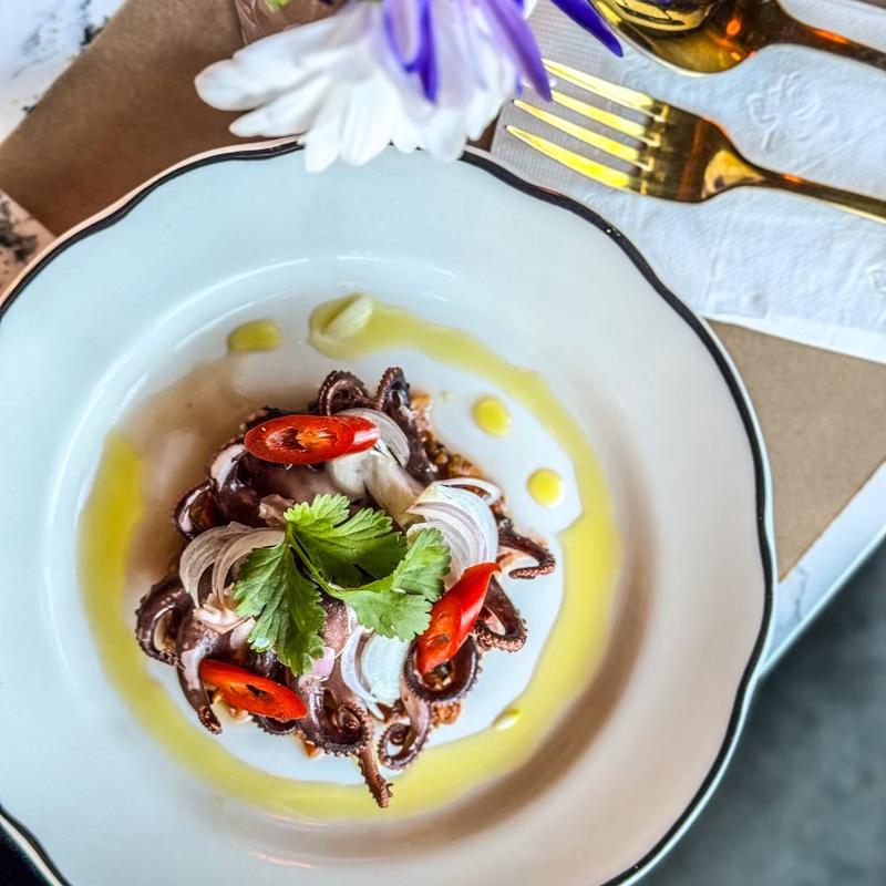Grilled baby squid served with olive oil and Northern Thai style tomato-chili dip (contains chicken, cilantro, garlic, shallots)