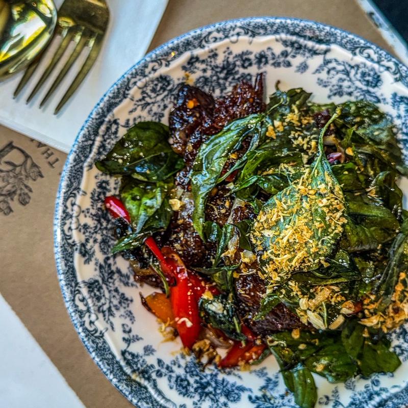 Grilled strip loin, toasted rice powder, and fried garlic served with sticky rice, and Thai spicy sauce.